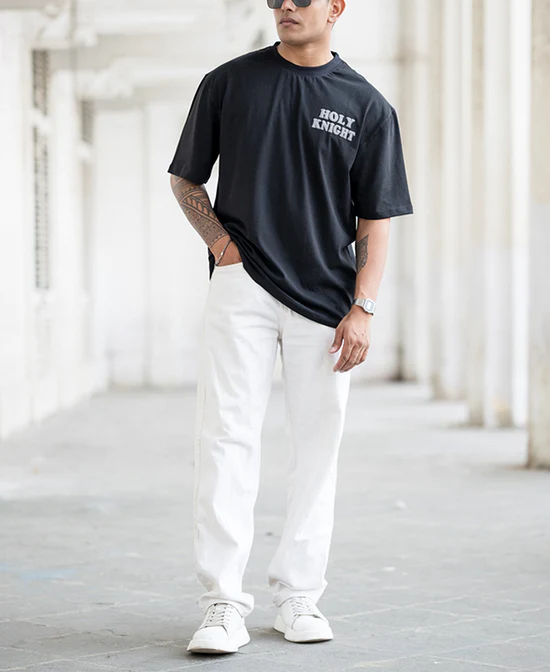 Make a bold statement with this black oversized printed T-shirt for men from India Store Mart. Crafted from a cotton-polyester blend, it delivers breathable comfort with a relaxed oversized fit. The striking print and half sleeves create an effortless streetwear vibe, perfect for casual days, weekend plans, and everyday styling.