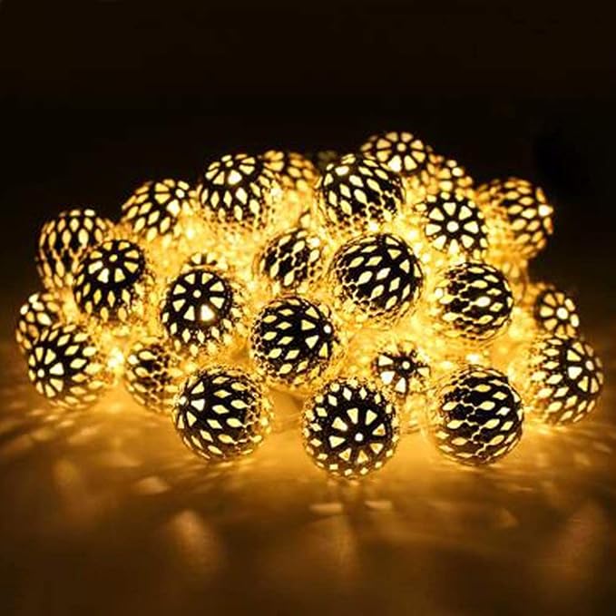 Create a magical ambiance with the Litehom Copper Moroccan Ball 11 Ft Fairy String Lights. Designed with 16 beautifully crafted Moroccan-style ball covers, these warm white LED lights are the perfect blend of tradition and modern style, making them ideal for Diwali lights, festive decorations, home décor, and special events.