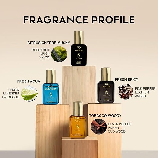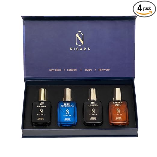 • Set of 4 Premium Fragrances: Experience the sophistication of Nisara’s luxury men’s perfumes: Men of the Night, Blue Seduction, The Legend, and Smoky Oud. Each scent is crafted with high-quality oils.