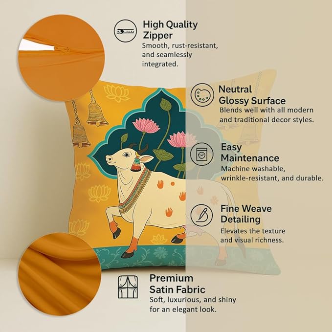 STITCHNEST Satin Ethnic Cushion Covers with Cow & Lotus Art add elegance to your home décor. This pack of 5 (16×16 inches) covers is perfect for living rooms, sofas, and festive decoration.